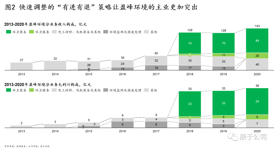 盈峰環(huán)境2015年進(jìn)入環(huán)保產(chǎn)業(yè),經(jīng)歷過(guò)一系列小型并購(gòu)但毫無(wú)起色的彎路之后,2018年開(kāi)始聚焦環(huán)衛(wèi)行業(yè),當(dāng)年以152.5億元全資收購(gòu)中聯(lián)環(huán)境,正式進(jìn)入環(huán)衛(wèi)裝備及環(huán)衛(wèi)運(yùn)營(yíng)一體化服務(wù)領(lǐng)域。收購(gòu)?fù)瓿珊?,環(huán)衛(wèi)裝備及環(huán)衛(wèi)服務(wù)業(yè)務(wù)的占比超過(guò)80%,成為公司的核心主業(yè),到2020年收入規(guī)模就達(dá)到了143億,幾乎是2017年49億的3倍(見(jiàn)圖2)。