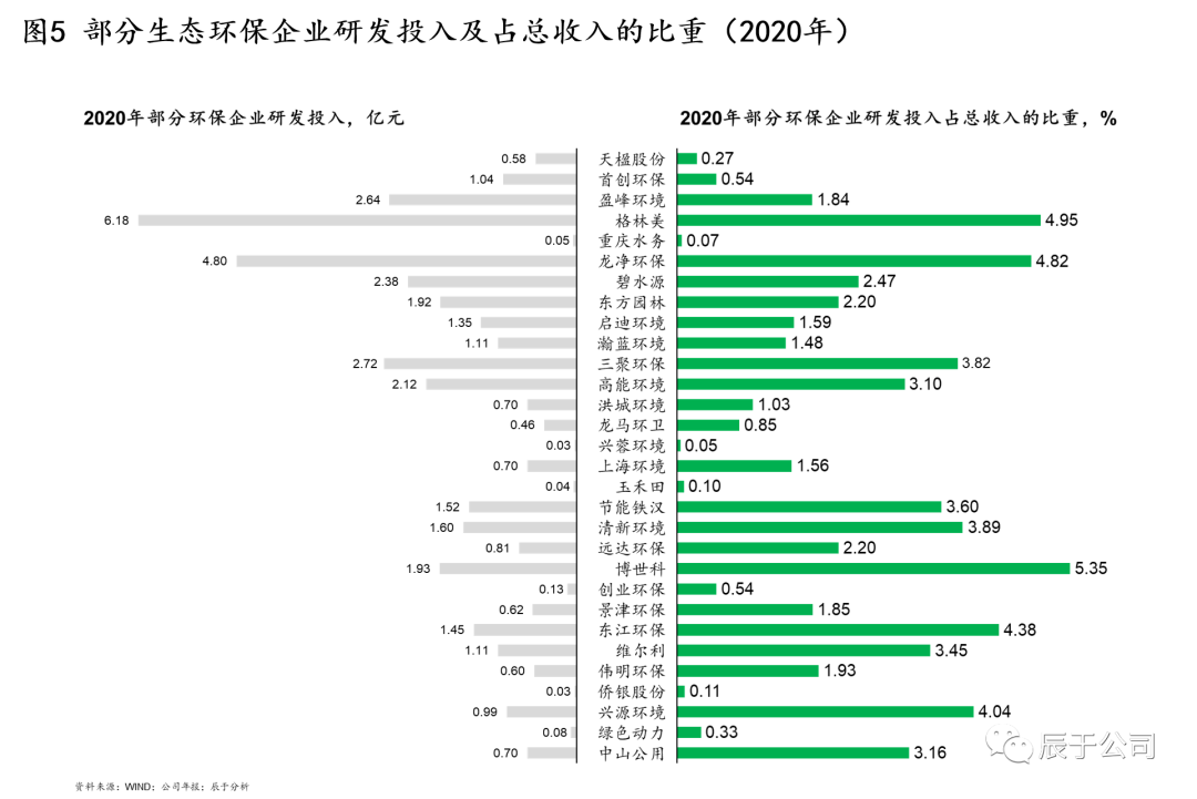 不得不說(shuō),大部分生態(tài)環(huán)保企業(yè)并不重視技術(shù)創(chuàng)新投入。對(duì)國(guó)內(nèi)環(huán)保上市企業(yè)的統(tǒng)計(jì)發(fā)現(xiàn),很多企業(yè)每年的研發(fā)投入不足2億元,占收入的比重不足3%(見(jiàn)圖5)。即使全球巨頭蘇伊士環(huán)境,每年研發(fā)投入近1億歐元,占其收入的比重不足1%。