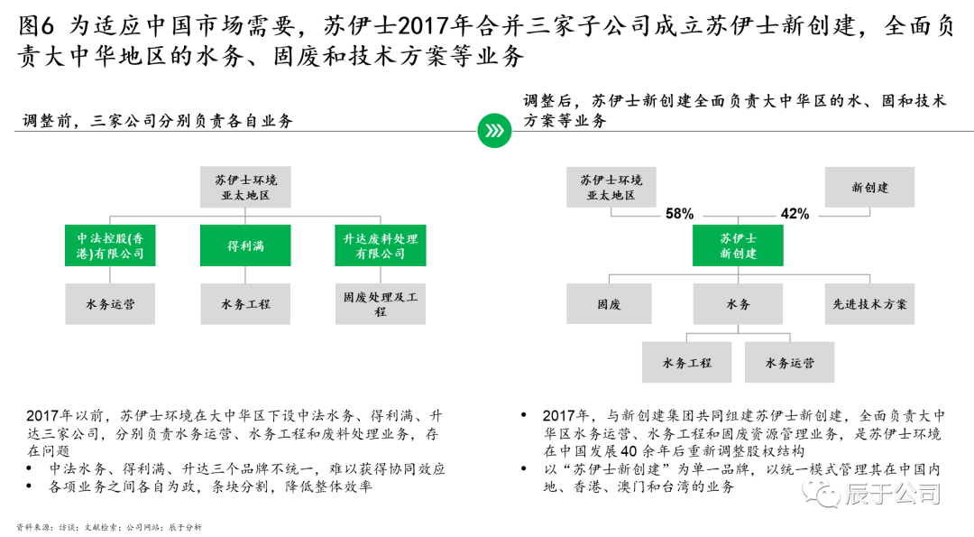 蘇伊士中國(guó)也在2017年對(duì)其組織架構(gòu)進(jìn)行了優(yōu)化。2017年以前,蘇伊士在大中華區(qū)下設(shè)中法水務(wù)、得利滿(mǎn)、升達(dá)三家公司,分別負(fù)責(zé)水務(wù)運(yùn)營(yíng)、水務(wù)工程和固廢廢物處理業(yè)務(wù),由于三個(gè)品牌不統(tǒng)一、難以獲得協(xié)同效應(yīng),各業(yè)務(wù)之間各自為政、條塊分割,降低了整體效率。對(duì)此,2017年蘇伊士與新創(chuàng)建集團(tuán)共同組建蘇伊士新創(chuàng)建,全面負(fù)責(zé)公司在大中華地區(qū)的水務(wù)運(yùn)營(yíng)、水務(wù)工程和固廢資源管理業(yè)務(wù),這是蘇伊士在中國(guó)發(fā)展 40 余年后重新調(diào)整股權(quán)結(jié)構(gòu),同時(shí)以“蘇伊士新創(chuàng)建”為單一品牌,以統(tǒng)一模式管理其在中國(guó)內(nèi)地、香港、澳門(mén)和臺(tái)灣的業(yè)務(wù)(見(jiàn)圖6)。2021年初對(duì)蘇伊士新創(chuàng)建和蘇渝兩家公司的股權(quán)收購(gòu)則進(jìn)一步強(qiáng)化了組織合力。