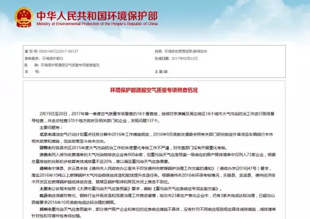2月19日至20日,2017年第一季度空氣質(zhì)量專項督查的18個督查組,繼續(xù)對京津冀及周邊地區(qū)18個城市大氣污染防治工作進行現(xiàn)場督導(dǎo)檢查,共走訪檢查370個地方政府及相關(guān)部門和企業(yè),發(fā)現(xiàn)問題137個。