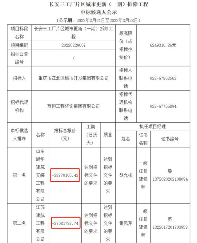這個奇葩的案例,就是不久前發(fā)布中標(biāo)公告的重慶市長安三工廠片區(qū)城市更新(一期)拆除工程項目。中標(biāo)人為山東鴻華建筑安裝工程有限公司(私企),中標(biāo)金額約為“-3877.01萬元”。更有意思的是,第二中標(biāo)人和第三中標(biāo)人的報價分別為-3708.18萬元和-3517.51萬元,也均為負(fù)數(shù)。