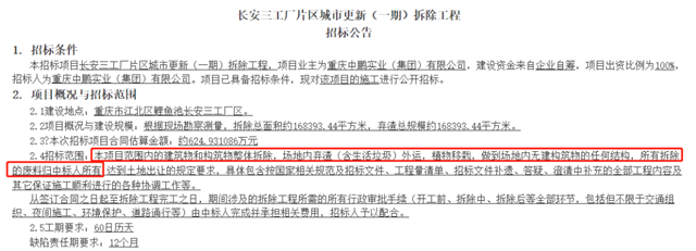 2022年2月23日,重慶中鵬實業(yè)(集團(tuán))有限公司發(fā)布了長安三工廠片區(qū)城市更新(一期)拆除工程的招標(biāo)公告。招標(biāo)公告稱,拆除總面積約168393.44平方米,棄渣總規(guī)模約168393.44平方米,合同金額約為約624.931086萬元。