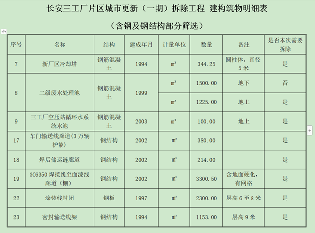 招標(biāo)文件附件中的《建構(gòu)筑物明細(xì)表》顯示,本次拆除共計26項內(nèi)容,幾乎全部為“新廠區(qū)冷卻塔、三工廠空壓站循環(huán)水系統(tǒng)水池、焊后儲運鏈廊道”等工廠廠區(qū)構(gòu)建及附近道路。可見,本次一期拆除的范圍應(yīng)該集中在該片區(qū)的工業(yè)用地內(nèi)。