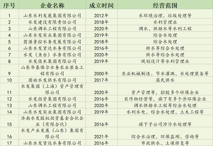 據(jù)中國(guó)水網(wǎng)不完全統(tǒng)計(jì),水發(fā)集團(tuán)旗下涉足環(huán)保的企業(yè)有17家: