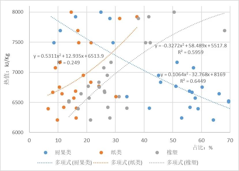 根據(jù)生活垃圾理論燃燒熱值的計(jì)算公式,對垃圾熱值影響較大的組分為廚果類、紙類及橡塑類。選取2018年1月-2019年12月生活垃圾廚果類、紙類及橡塑類占比變化與熱值數(shù)據(jù)耦合分析,廚果類占比與垃圾熱值呈負(fù)相關(guān)關(guān)系,紙類、橡塑類與熱值呈正相關(guān)關(guān)系,見圖15。按CJ/T313-2019《生活垃圾采樣和分析方法》的垃圾熱值計(jì)算公式,用垃圾成分計(jì)算得到高于實(shí)際運(yùn)行熱值的結(jié)果,說明實(shí)際運(yùn)行中可通過調(diào)整垃圾坑的停留時(shí)間等維持垃圾熱值在一個(gè)穩(wěn)定、可承受的范圍[7]。