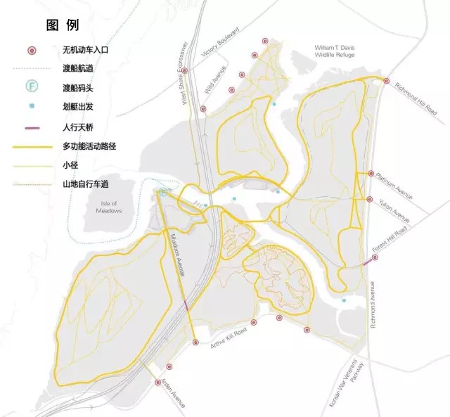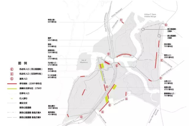(5)在生態(tài)敏感度允許條件下優(yōu)化交通網(wǎng)絡(luò),提升公園在紐約市域及區(qū)域范圍內(nèi)的可達性;