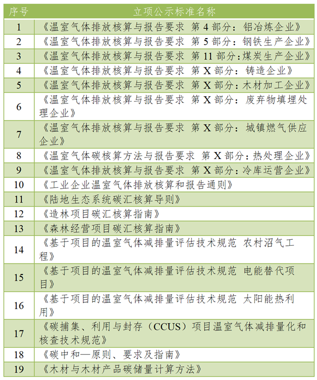 國(guó)家市場(chǎng)監(jiān)督管理總局對(duì)《溫室氣體排放核算與報(bào)告要求 第4部分:鋁冶煉企業(yè)》等10項(xiàng)溫室氣體碳核算標(biāo)準(zhǔn),《陸地生態(tài)系統(tǒng)碳匯核算導(dǎo)則》等3項(xiàng)碳匯核算標(biāo)準(zhǔn),《基于項(xiàng)目的溫室氣體減排量評(píng)估技術(shù)規(guī)范 農(nóng)村沼氣工程》等4項(xiàng)碳減排標(biāo)準(zhǔn),以及《碳中和—原則、要求及指南》《木材與木材產(chǎn)品碳儲(chǔ)量計(jì)算方法》等標(biāo)準(zhǔn)進(jìn)行立項(xiàng)公示。具體見下表。