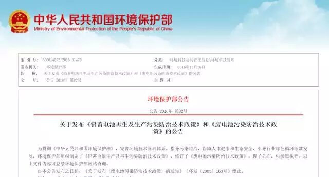 為貫徹《中華人民共和國環(huán)境保護(hù)法》,完善環(huán)境技術(shù)管理體系,指導(dǎo)污染防治,保障人體健康和生態(tài)安全,引導(dǎo)行業(yè)綠色循環(huán)低碳發(fā)展,環(huán)境保護(hù)部組織制定了《鉛蓄電池生產(chǎn)及再生污染防治技術(shù)政策》、修訂了《廢電池污染防治技術(shù)政策》。現(xiàn)予公布,供參照執(zhí)行。以上文件內(nèi)容可登錄環(huán)境保護(hù)部網(wǎng)站查詢。