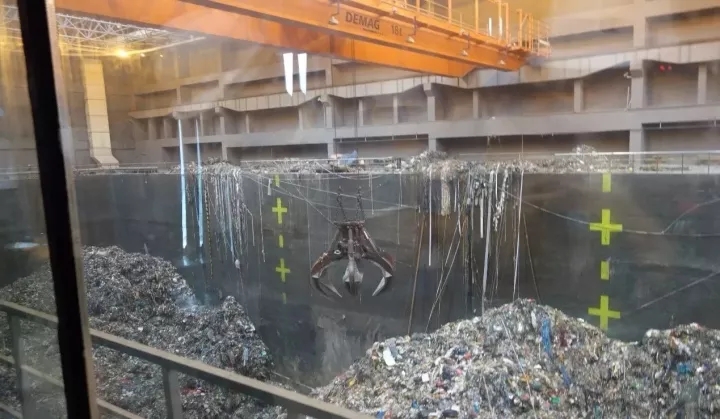 首先,生活垃圾運(yùn)輸車經(jīng)地磅稱重后,由上料坡道進(jìn)入卸料大廳。在垃圾吊控制室的統(tǒng)一指揮下,運(yùn)輸車將垃圾由指定卸料門卸入垃圾池內(nèi)。垃圾池采用全封閉性設(shè)計(jì),氣壓為負(fù)33pa,有效防止了臭氣外逸。垃圾池上方有四臺(tái)垃圾吊抓斗(三用一備),每臺(tái)容積為12立方米,是目前國(guó)內(nèi)最大的單體抓斗,采用手動(dòng)+半自動(dòng)式操作將抓取的垃圾從池內(nèi)送入進(jìn)料口,進(jìn)入焚燒爐焚燒。