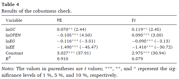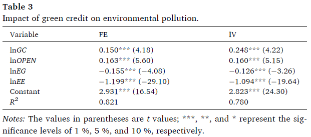 為了緩解模型中存在的由變量缺失或綠色信貸測量誤差引起的內(nèi)生問題,本研究采用綠色信貸的一階滯后項作為工具變量。表3中報告的工具變量法(IV)產(chǎn)生的估計結(jié)果與固定效應(yīng)模型基本一致??刂谱兞康南禂?shù)和顯著性水平也與之前的結(jié)果一致。
