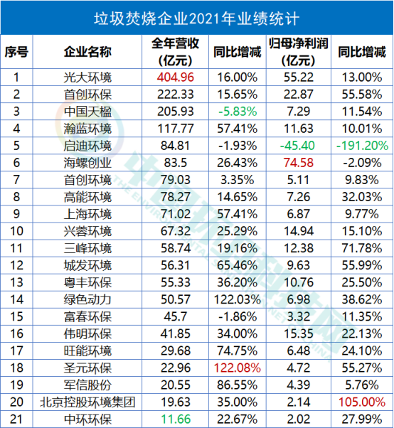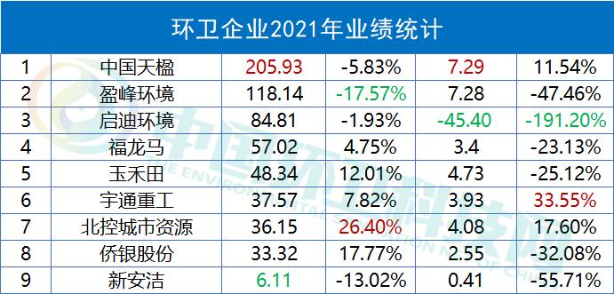工程建設(shè)方面,建成投運(yùn)項(xiàng)目91個(gè),建成完工項(xiàng)目8個(gè);新開工項(xiàng)目51個(gè),完工并交付的環(huán)境修復(fù)服務(wù)6個(gè)、垃圾分類服務(wù)1個(gè)、EMC項(xiàng)目4個(gè)以及EPC項(xiàng)目9個(gè)。2021年,光大環(huán)境累計(jì)處理生活垃圾43,452,000噸,處理危廢及固廢269,000噸,提供綠色電力22,271,602,000千瓦時(shí),可供18,559,000個(gè)家庭一年使用,相當(dāng)于節(jié)約標(biāo)煤8,909,000噸,減少二氧化碳排放20,211,000噸。同期處理污水1,698,710,000立方米,處理垃圾發(fā)電廠滲濾液9,635,000立方米,減少COD排放740,000噸。在凈利榜中,海螺創(chuàng)業(yè)以74.58億元的歸母凈利潤(rùn)雄踞榜首。海螺創(chuàng)業(yè),2013年12月在香港聯(lián)合交易所主板上市(股票代碼:00586.HK),是一家提供節(jié)能環(huán)?!耙粩堊印苯鉀Q方案的大型企業(yè)集團(tuán),產(chǎn)業(yè)涉及節(jié)能、環(huán)保、新型建材、港口物流四大類,業(yè)務(wù)涵蓋生活垃圾處理、固廢危廢處置、黑臭水體治理、新型建材、港口貿(mào)易、余熱發(fā)電、高效節(jié)能立磨等。細(xì)分業(yè)務(wù)板塊,2021年在垃圾處置領(lǐng)域,海螺創(chuàng)業(yè)營(yíng)收57.44億元,同比增長(zhǎng)19.38%,占全部營(yíng)收比重為68.78%。▲ 海螺創(chuàng)業(yè)分業(yè)務(wù)收入年報(bào)披露,2021年,海螺創(chuàng)業(yè)垃圾發(fā)電業(yè)務(wù)板塊共接收生活垃圾約540萬噸,處置生活垃圾約456萬噸,上網(wǎng)電量約16.65億度,按照入爐量計(jì)算的平均噸上網(wǎng)電量約為365度,較去年同比提高19度。目前,海螺創(chuàng)業(yè)已成功取得貴州清鎮(zhèn)、重慶巫山、吉林洮南、河北圍場(chǎng)、越南春山等13個(gè)項(xiàng)目以及并購(gòu)的10個(gè)項(xiàng)目,共計(jì)23個(gè)焚燒發(fā)電項(xiàng)目,涉及產(chǎn)能規(guī)模約567萬噸/年。3月30日,海螺創(chuàng)業(yè)分拆海螺環(huán)保成功在香港聯(lián)合交易所主板上市。日前,又宣布擬分拆海創(chuàng)綠能于上海證券交易所獨(dú)立上市。在大部分上市企業(yè)都實(shí)現(xiàn)盈利的背景下,博世科和啟迪環(huán)境成為唯二虧損的企業(yè),前者虧損5.15億,后者的虧損更是達(dá)到了驚人的45.4億。博世科,是一家位于廣西的環(huán)保企業(yè),2015年,在深交所創(chuàng)業(yè)板上市,業(yè)務(wù)領(lǐng)域重點(diǎn)為工業(yè)環(huán)境治理、城鄉(xiāng)環(huán)境、土壤環(huán)境修復(fù)、固廢處置與危廢處置、智慧環(huán)衛(wèi)、環(huán)境服務(wù)業(yè)等。對(duì)于虧損原因,博世科在年報(bào)中披露主要是受到疫情反復(fù)、經(jīng)濟(jì)下行、行業(yè)競(jìng)爭(zhēng)加劇、市政項(xiàng)目結(jié)算和老舊項(xiàng)目回款不及預(yù)期等內(nèi)外部發(fā)展阻力綜合影響。啟迪環(huán)境,這個(gè)曾經(jīng)的固廢領(lǐng)域龍頭企業(yè),最近頻頻登上環(huán)衛(wèi)科技網(wǎng)的頭條,對(duì)于它已無須過多贅述。可以說,它的虧損早就在業(yè)內(nèi)人士的預(yù)料之中。而對(duì)于虧損原因,啟迪環(huán)境在年報(bào)中這樣解釋:“系公司對(duì)現(xiàn)有資產(chǎn)、項(xiàng)目進(jìn)行全面梳理,部分項(xiàng)目擬戰(zhàn)略性退出,公司根據(jù)《企業(yè)會(huì)計(jì)準(zhǔn)則》規(guī)定對(duì)相關(guān)資產(chǎn)計(jì)提減值所致。不過,該虧損對(duì)公司當(dāng)前經(jīng)營(yíng)及償債能力未產(chǎn)生重大影響?!?/span>具體來說,原因包括對(duì)已停建項(xiàng)目、擬退出項(xiàng)目計(jì)提資產(chǎn)減值;對(duì)資產(chǎn)運(yùn)營(yíng)效率較低、不能持續(xù)運(yùn)營(yíng)和公司整體戰(zhàn)略涵蓋不到的項(xiàng)目進(jìn)行退出、轉(zhuǎn)讓處置;對(duì)部分款項(xiàng)回收存在實(shí)質(zhì)性障礙的應(yīng)收賬款、其他應(yīng)收款、長(zhǎng)期應(yīng)收款及應(yīng)收票據(jù)計(jì)提信用減值損失等。如今,博世科于2021年完成混改,廣環(huán)投成為其控股股東。啟迪環(huán)境與城發(fā)環(huán)境的合并雖然存在客觀上的“不確定性”,混改終究會(huì)完成。我們也希望完成混改后的兩家企業(yè),能夠迅速走上正軌,扭虧為盈。天楹、盈峰領(lǐng)跑,唯宇通、北控實(shí)現(xiàn)雙增這36家上市企業(yè)中有9家公司主營(yíng)業(yè)務(wù)為環(huán)衛(wèi)板塊,中國(guó)天楹、盈峰環(huán)境和啟迪環(huán)境領(lǐng)跑營(yíng)收榜,中國(guó)天楹、盈峰環(huán)境和玉禾田則在凈利榜上名列前茅。中國(guó)天楹,早在1994年就登陸深交所主板A股。其以垃圾焚燒發(fā)電、城市環(huán)境服務(wù)、環(huán)保裝備制造為壓艙石,打通了從前端清掃、中轉(zhuǎn)到分選、末端處置的城市環(huán)境服務(wù)全產(chǎn)業(yè)鏈。2021年,在城市環(huán)境服務(wù)板塊,其營(yíng)業(yè)收入達(dá)到90.84億元,占全部營(yíng)收比重44.11%。2021年,中國(guó)天楹中標(biāo)了烏海市濱河新區(qū)環(huán)衛(wèi)作業(yè)市場(chǎng)化運(yùn)營(yíng)項(xiàng)目,如皋長(zhǎng)江鎮(zhèn)道路、河道保潔、垃圾清運(yùn)及農(nóng)村環(huán)境整治服務(wù)外包項(xiàng)目,張北縣草原天路環(huán)境衛(wèi)生服務(wù)政府采購(gòu)項(xiàng)目以及任丘市城鄉(xiāng)環(huán)衛(wèi)一體化農(nóng)村部分對(duì)外承包項(xiàng)目等多個(gè)城市環(huán)境服