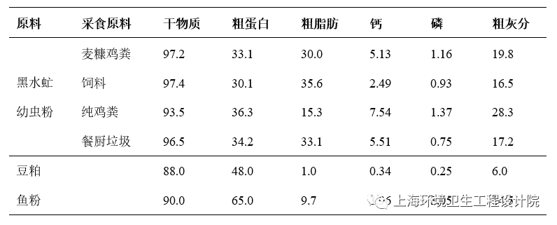 研究表明,黑水虻幼蟲的營養(yǎng)價值較高,營養(yǎng)組成具有一定的可塑性。分析表1數(shù)據(jù)可知,其體內(nèi)特定營養(yǎng)組分的含量高低可通過調(diào)節(jié)其采食的有機(jī)廢棄物的營養(yǎng)來實(shí)現(xiàn)。黑水虻烘干蟲粉中粗脂肪、鈣和灰分的含量受到采食底物的影響較大,而蛋白質(zhì)和氨基酸組成則相對比較穩(wěn)定。雖然幼蟲的氨基酸總含量低于黃粉蟲、蠅蛆、桑蠶蛹的氨基酸含量,但氨基酸如賴氨酸、蛋氨酸、亮氨酸、纈氨酸和酪氨酸含量較高,可通過優(yōu)化飼料配方增加飼料氨基酸含量,并不影響作為動物飼料蛋白的品質(zhì)。表1 采食不同底物黑水虻與豆粕和魚粉的營養(yǎng)成分含量(%)比較