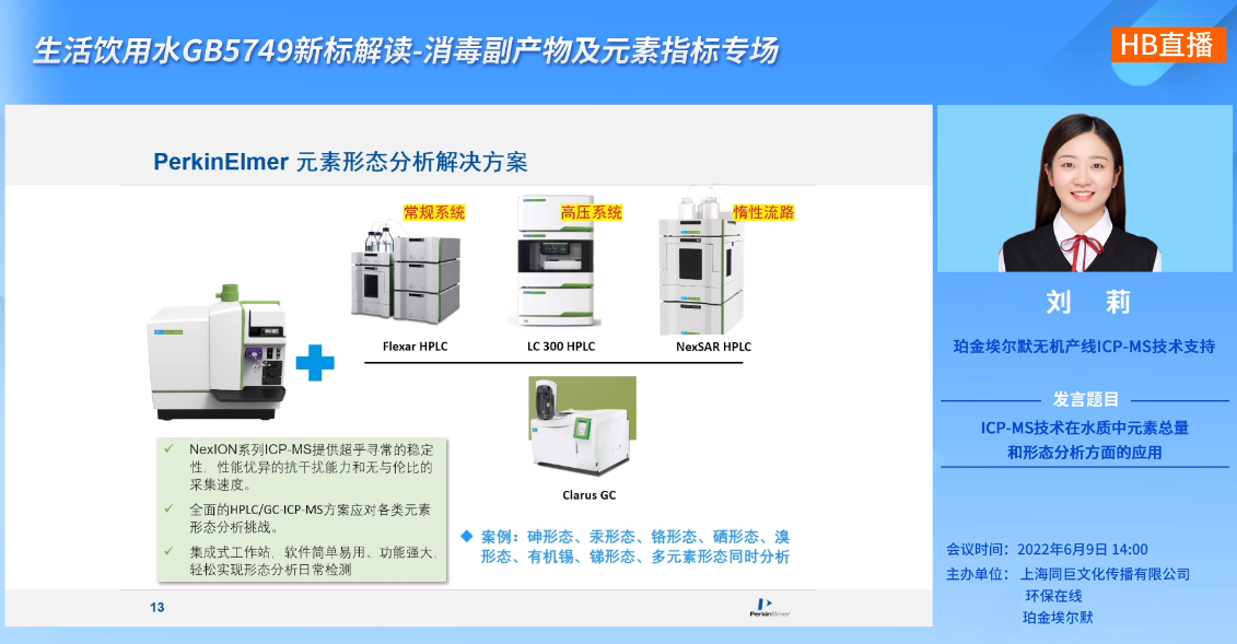 珀金埃爾默無機(jī)產(chǎn)線ICP-MS技術(shù)支持劉莉介紹了ICP-MS技術(shù)在水質(zhì)檢測方面的應(yīng)用,劉莉從GB 5749和GB 5750的變化展開,介紹了GB5749與舊版相比更新的內(nèi)容,新標(biāo)準(zhǔn)的水質(zhì)指標(biāo)由106項(xiàng)調(diào)整為97項(xiàng),水質(zhì)參考指標(biāo)由28項(xiàng)增加到55項(xiàng)。隨后劉莉介紹了針對ICP-MS技術(shù)在水質(zhì)中元素總量和形態(tài)分析方面珀金埃爾默的特色方案,如智能電子稀釋技術(shù)。隨后,劉莉介紹了GB 5750元素分析最大變化——增加元素形態(tài)分析方法,珀金埃爾默在元素形態(tài)分析方面也有著豐富的解決方案。NexION系列ICP-MS提供超常的穩(wěn)定性,性能優(yōu)異的抗干擾能力和出色的采集速度;全面的HPLC/GC ICP-MS方案應(yīng)對各類元素形態(tài)分析挑戰(zhàn);集成式工作站,軟件簡單易用、功能強(qiáng)大,輕松實(shí)現(xiàn)形態(tài)分析日常檢測。