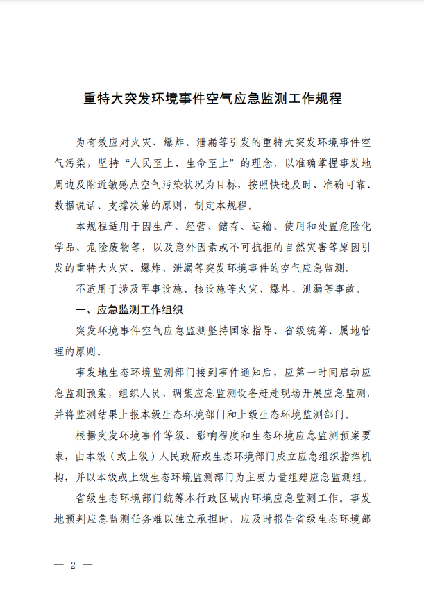 2022年6月15日,生態(tài)環(huán)境部印發(fā)《重特大突發(fā)環(huán)境事件空氣應(yīng)急監(jiān)測(cè)工作規(guī)程》,本規(guī)程適用于因生產(chǎn)、經(jīng)營、儲(chǔ)存、運(yùn)輸、使用和處置危險(xiǎn)化學(xué)品、危險(xiǎn)廢物等,以及意外因素或不可抗拒的自然災(zāi)害等原因引發(fā)的重特大火災(zāi)、爆炸、泄漏等突發(fā)環(huán)境事件的空氣應(yīng)急監(jiān)測(cè)。