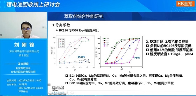 最后,在電池回收濕法工藝弊端凸顯的背景下,新型萃取體系值得期待嗎?這就要聽劉剛鋒技術(shù)總監(jiān)怎么說(shuō)啦。“使用BC196處理正極溶液得到鎳鈷錳電池級(jí)前體相較于傳統(tǒng)流程每噸可節(jié)省10-20%的成本”,從萃取劑綜合性能研究,到鎳鎂分離、鎳鋰分離,再到與現(xiàn)有流程的對(duì)比,一應(yīng)俱全。