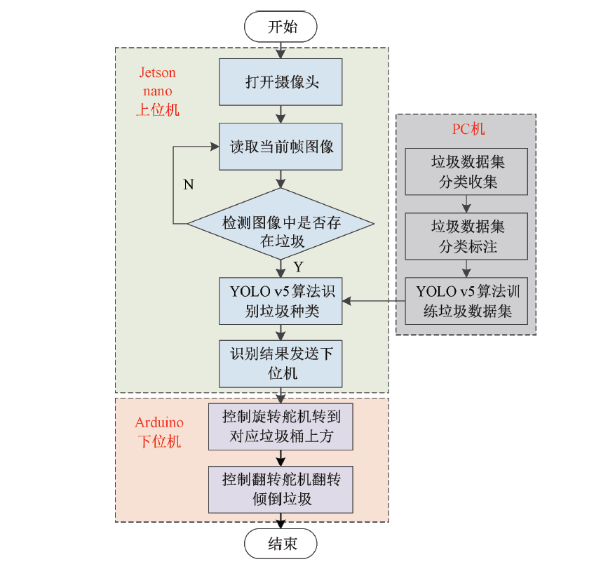 本設(shè)計(jì)不僅實(shí)現(xiàn)了垃圾識(shí)別軟件程序設(shè)計(jì),還在Jetson nano 平臺(tái)下實(shí)現(xiàn)了識(shí)別算法的嵌入式硬件化,同時(shí)配合機(jī)械結(jié)構(gòu)設(shè)計(jì),完成了實(shí)際應(yīng)用的自動(dòng)分類(lèi)垃圾箱的設(shè)計(jì)。軟件部分采用最新深度學(xué)習(xí)算法模型YOLO v5進(jìn)行垃圾識(shí)別,識(shí)別結(jié)果通過(guò)串口通信發(fā)送至Arduino控制板中,由 Arduino控制板控制旋轉(zhuǎn)舵機(jī)的運(yùn)動(dòng)以及翻轉(zhuǎn)舵機(jī)運(yùn)動(dòng),從而實(shí)現(xiàn)垃圾自動(dòng)分類(lèi)投放。