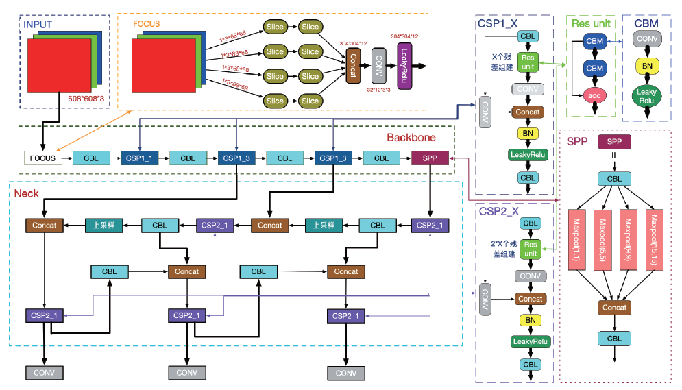 2 ) Blackbone 網(wǎng)絡(luò):以Focus 結(jié)構(gòu)作為基準(zhǔn)網(wǎng)絡(luò),原始圖像輸人到Focus結(jié)構(gòu)中,使用32個(gè)卷積核進(jìn)行切片操作,最終將其變成304×304×32的特征圖,其中應(yīng)用了CSP1__X 結(jié)構(gòu)。