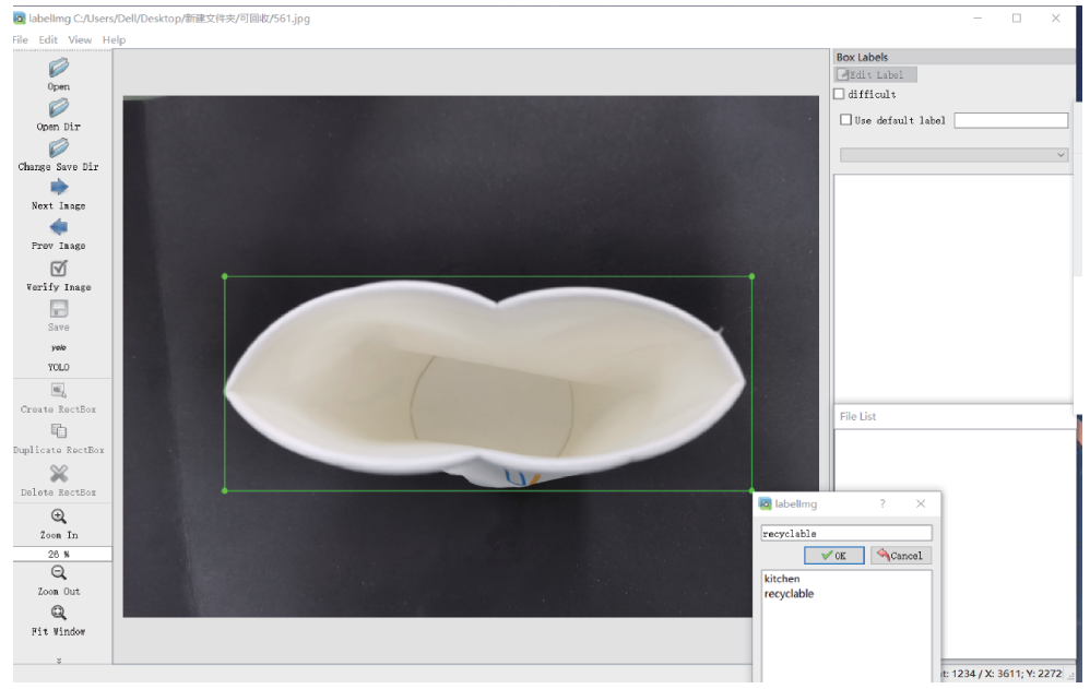 本設(shè)計(jì)以常見(jiàn)垃圾為例,尤其針對(duì)非住宅區(qū)的公共場(chǎng)所(如地鐵站﹑火車(chē)站、學(xué)校等場(chǎng)所)所產(chǎn)生的垃圾為例進(jìn)行算法研究,收集的常見(jiàn)垃圾數(shù)據(jù),包括食品包裝紙、礦泉水瓶、飲料瓶、易拉罐、塑料盒、電池、水果皮核、干果殼等。每一小類(lèi)采集了約100張數(shù)據(jù),包括不同拍攝角度,不同腐壞程度等,共采集了4000張數(shù)據(jù),其中 3500張用于訓(xùn)練,500張用于測(cè)試。再將每小類(lèi)劃分到廚余垃圾、可回收垃圾、有害垃圾以及其他垃圾中。部分不同垃圾的真實(shí)訓(xùn)練數(shù)據(jù)集如圖6所示。標(biāo)注工具采用LabelImg 軟件進(jìn)行標(biāo)注,標(biāo)注過(guò)程如圖7所示。