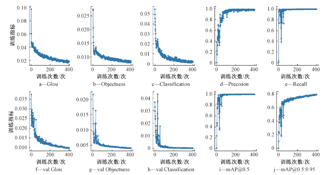 圖9反映了隨著次數(shù)增加,訓(xùn)練指標(biāo)的變化趨勢(shì)。總訓(xùn)練次數(shù)為400輪。其中, GIoU為訓(xùn)練數(shù)據(jù)集模型的損失函數(shù);Objectness為目標(biāo)的損失函數(shù)均值,值越小目標(biāo)檢測(cè)越準(zhǔn)確;Classification為分類(lèi)的損失函數(shù)均值,值越小目標(biāo)檢測(cè)越準(zhǔn)確;Precision表示精度;Recall表示召回率。從圖9可以看出:隨著訓(xùn)練次數(shù)的增加,精度和召回率在不斷升高,最終穩(wěn)定在接近100%的數(shù)值附近; f~h前面加了val,表示為驗(yàn)證數(shù)據(jù)集的結(jié)果;mAP表示mean AveragePrecision , 即平均精度, mAP@ 0.5參數(shù)為損失函數(shù)設(shè)為0.5時(shí),每一類(lèi)圖片的AP值的平均; mAP@ 0.5 :0.95表示損失函數(shù)在步長(zhǎng)為0.5、范圍在0.5~0.95閾值下的平均mAP。從圖9中可以看出,當(dāng)訓(xùn)練達(dá)到80輪左右時(shí), mAP@ 0.5上升到了1.0 , mAP@ 0.5∶0.95上升到了0.7左右,并且隨著訓(xùn)練輪數(shù)的增加不斷提高,最終達(dá)到0.8左右,訓(xùn)練精度較高。
