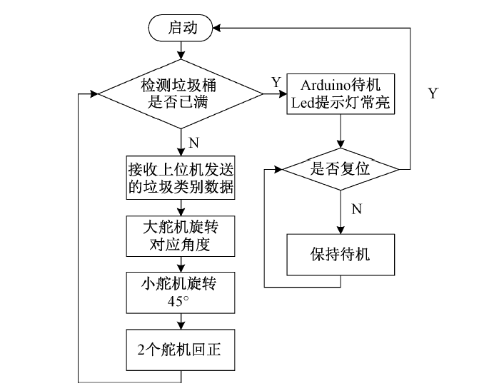 下位機(jī)軟件工作流程如圖5所示。首先啟動(dòng)Arduino,通過(guò)光電傳感器與紅外發(fā)射器模塊判斷垃圾桶是否已滿(mǎn)。若垃圾桶已滿(mǎn),向上位機(jī)發(fā)送已滿(mǎn)信號(hào)、點(diǎn)亮Led燈同時(shí)進(jìn)入待機(jī)狀態(tài)。若垃圾桶未滿(mǎn),則Arduino接收上位機(jī)信號(hào),信號(hào)0、1、2、3分別對(duì)應(yīng)廚余垃圾、可回收垃圾、有害垃圾、其他垃圾,Arduino與上位機(jī)Jetson Nano 之間的通信通過(guò)ASCII碼傳輸,對(duì)應(yīng)接收到的值為48、49、50、51 ,通過(guò)對(duì)這4個(gè)值的判斷,來(lái)控制舵機(jī)模塊準(zhǔn)確將垃圾投進(jìn)對(duì)應(yīng)的垃圾箱。大舵機(jī)對(duì)應(yīng)不同種類(lèi)垃圾,0號(hào)垃圾桶逆時(shí)針旋轉(zhuǎn)45°,1號(hào)垃圾桶順時(shí)針旋轉(zhuǎn)45°,2號(hào)垃圾桶順時(shí)針旋轉(zhuǎn)135°,3號(hào)垃圾桶逆時(shí)針旋轉(zhuǎn)135°,從而將云臺(tái)對(duì)準(zhǔn)相應(yīng)的垃圾桶,之后小舵機(jī)旋轉(zhuǎn)30°將翻斗抬起,將垃圾準(zhǔn)確迅速地投入垃圾桶。2個(gè)動(dòng)作完成后,2個(gè)舵機(jī)分別回到初始0°狀態(tài)。投放完畢后﹐翻斗、云臺(tái)分別回正,同時(shí)檢測(cè)垃圾桶是否已滿(mǎn),并重復(fù)上述步驟。