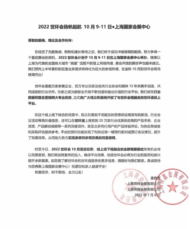 在經(jīng)歷了無數(shù)焦慮,煎熬和漫長(zhǎng)等待之后,我們終于成功沖破疫情的阻撓,努力爭(zhēng)得一個(gè)重啟展會(huì)的契機(jī),2022世環(huán)會(huì)計(jì)劃于10月9-11日在上海國(guó)家會(huì)展中心舉辦。隨著以上海為代表的全國(guó)各大城市“摘星”話題不斷登上網(wǎng)絡(luò)熱搜,展會(huì)開放的腳步聲也越來越近。我們預(yù)判上半年累積的巨量業(yè)務(wù)需求將轉(zhuǎn)化為巨大的參觀熱情,在金秋10月的世環(huán)會(huì)現(xiàn)場(chǎng)噴薄而出!