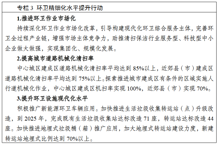 鼓勵推廣城鄉(xiāng)環(huán)衛(wèi)一體化,2025 年實現(xiàn)城鄉(xiāng)環(huán)衛(wèi)一體化作業(yè)區(qū)域占比不低于 50%。持續(xù)深化環(huán)衛(wèi)作業(yè)設施設備科技化、環(huán)衛(wèi)工人年輕化、監(jiān)管服務智慧化“三化”建設,著力構建結構合理、技術先進、能力充足的環(huán)衛(wèi)設施設備和環(huán)衛(wèi)隊伍保障體系,打造成都環(huán)衛(wèi)產業(yè)品牌,爭創(chuàng)中國最干凈城市。