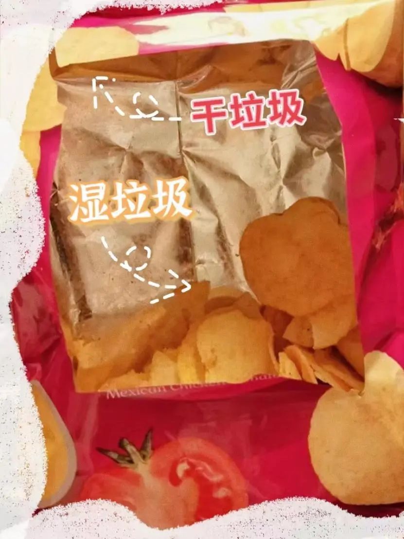 沒吃完的:吃剩的薯片——倒進(jìn)濕垃圾桶;包裝袋——扔進(jìn)干垃圾桶