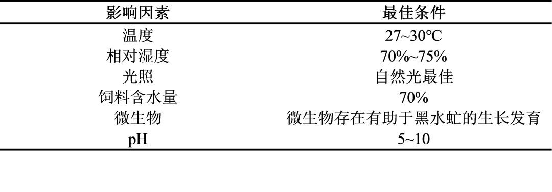 黑水虻幼蟲(chóng)養(yǎng)殖會(huì)受到溫度、相對(duì)濕度、光照條件、飼料含水量、重金屬、共生微生物等因素的影響(表1)。