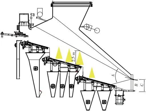 當(dāng)前生活垃圾焚燒爐廣泛采用的爐膛火焰監(jiān)視系統(tǒng)基本上都是由早期應(yīng)用在水泥廠、鋼鐵廠的加熱爐、退火爐和氧化鋁廠等行業(yè)內(nèi)的高溫看火工業(yè)電視演變升級(jí)而來(lái)。內(nèi)窺式數(shù)字高清爐膛火焰監(jiān)視系統(tǒng)成像裝置主要由耐高溫針孔電動(dòng)鏡頭、寶石物鏡、光學(xué)濾光片、光圈焦距調(diào)節(jié)器等組成,配有電控推進(jìn)器、氣源控制柜、光端機(jī)等輔助設(shè)備。其核心問(wèn)題是如何在生活垃圾焚燒爐的高溫、多塵、強(qiáng)腐蝕環(huán)境中長(zhǎng)周期穩(wěn)定運(yùn)行,保證火焰畫(huà)面不丟包、不失真。1)優(yōu)勢(shì)特性分析。一是技術(shù)成熟、運(yùn)行穩(wěn)定。隨著我國(guó)近一二十年間生活垃圾發(fā)電廠的興建,爐膛火焰監(jiān)視系統(tǒng)的技術(shù)也處于不停地優(yōu)化和迭代之中,目前已能滿足穩(wěn)定、可靠的要求。其中常規(guī)配置參數(shù)為攝像頭300 萬(wàn)像素,響應(yīng)時(shí)間2 s,光圈(F數(shù))1.6,焦距2.4 mm。二是工作環(huán)境好。爐膛火焰監(jiān)視器探頭通常安裝于焚燒爐后墻,所處位置是垃圾燃燒最末端,常規(guī)工況下探頭周?chē)鸁煔鉁囟韧ǔ?lt;600 ℃。較之焚燒爐其他高溫環(huán)境已算“宜居地帶”。三是維護(hù)量小。焚燒爐后墻幾乎沒(méi)有結(jié)焦現(xiàn)象,常規(guī)爐膛火焰監(jiān)視探頭開(kāi)孔位置僅存有因爐膛偶爾正壓時(shí)煙氣外冒造成的積灰,積灰量不大,清理工作較為輕松。2)劣勢(shì)特性分析。一是參數(shù)單一。因垃圾焚燒行業(yè)爐型構(gòu)造和燃燒成分的特殊性,垃圾焚燒爐長(zhǎng)期采用的火焰探頭利用的是光學(xué)成像原理,運(yùn)行人員僅能通過(guò)觀察火焰形狀和位置來(lái)判斷焚燒爐工況,無(wú)法得到多維度參數(shù)。二是視角局限。爐膛火焰探頭通常位于焚燒爐后墻,安裝角度朝向爐內(nèi)成斜向上方向,與水平線夾角15°左右,探頭視場(chǎng)角通常>60°。以某大型列動(dòng)順推爐排焚燒爐為例,在此仰視角度下可以看到爐排燃燒段尾部、燃燼段前部?jī)擅婷黠@的火焰幕墻,由于火焰鋒面遮擋,很難觀察到燃燒段中前部的火焰狀況。 以某單臺(tái)750 t/d大型列動(dòng)順推爐排焚燒爐中爐膛火焰監(jiān)視器安裝位置和顯示畫(huà)面為實(shí)例,具體分析火焰成像狀態(tài)。其實(shí)際火焰成像畫(huà)面見(jiàn)圖1。成像角度是由焚燒爐后墻探頭位置向上仰視爐膛。因焚燒工況十分良好,靠近后墻的燃燼段區(qū)域幾乎沒(méi)有明火,燃燒段尾部成一面豎直、光亮的黃紅色火焰鋒面,高度約為2.5 m。對(duì)應(yīng)的爐膛火焰監(jiān)視器安裝示意如圖2所示。爐膛火焰探頭安裝在焚燒爐后墻,安裝位置與后墻觀火平臺(tái)地面距離為C(m)。開(kāi)孔傾角與水平方向夾角為B(°),有效視場(chǎng)角為A(°)。圖2中由黃色填充的三角形區(qū)域代表正常燃燒火焰,其中標(biāo)注高度2.5 m的區(qū)域?yàn)槿紵隣t排尾部火焰,即為圖1所顯示的火焰鋒面。顯然,從爐膛火焰監(jiān)視器向上望去,燃燒段前部、中部火焰為視野盲區(qū)。由于被燃燒段尾部火焰鋒面遮擋,通過(guò)火焰監(jiān)視器通常只能看到燃燒段尾部、燃燼段前部這兩個(gè)區(qū)域的火焰。