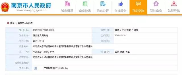 10月19日,南京市政府公布了《南京市低價值可回收物回收處理暫行辦法》,根據(jù)辦法規(guī)定,城市管理部門負責管理轄區(qū)內(nèi)低價值可回收物回收工作,并通過政府采購方式向企業(yè)購買低價值可回收物的回收、處理服務(wù)。辦法自今年11月20日起施行,有效期3年。