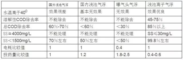 由表1可見,各項數(shù)據表明淺池氣浮處理效果優(yōu)于曝氣氣浮,在淺池氣浮中離子氣浮的COD、SS處理技術指標及使用效果更佳。