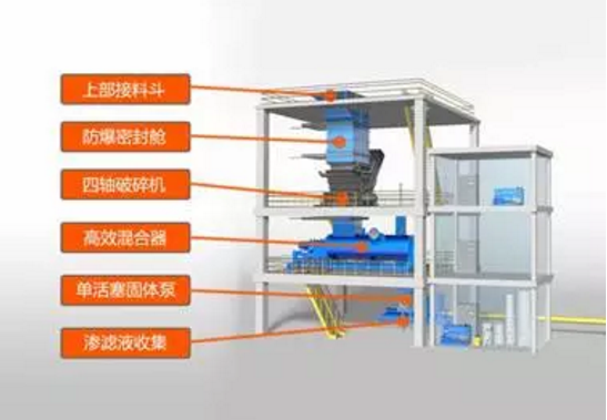 SMP+系統(tǒng)的核心裝備包括防爆密封艙、四軸破碎機(jī)、高效混合器和單活塞固體泵。