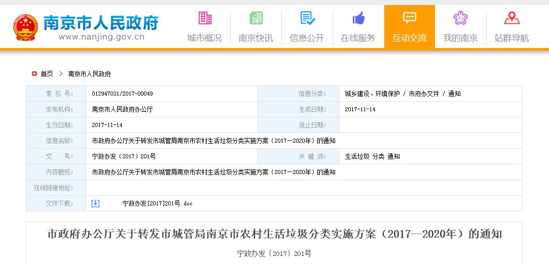 日前,南京市政府辦公廳關(guān)于轉(zhuǎn)發(fā)市城管局南京市農(nóng)村生活垃圾分類實施方案(2017—2020年)的通知。全文如下: