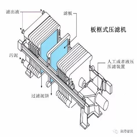 從壓濾機(jī)的示意圖可以看到,板框式壓濾機(jī)是由一張張濾板疊加而成的,濾板之間是有空間的,污泥注入這個(gè)濾板之間后,通過(guò)人工或者液壓的壓濾裝置,把污泥中的水分?jǐn)D壓出去,形成泥餅,擠壓出來(lái)的過(guò)濾液通過(guò)濾板上設(shè)置的濾出液管流出板框壓濾機(jī)外。