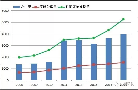 2008~2015年危廢許可證規(guī)模、產(chǎn)生量與實(shí)際經(jīng)營(yíng)規(guī)模對(duì)比趨勢(shì)圖