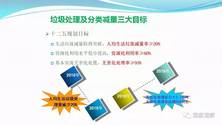 2010年以來的工作是基于十二五規(guī)劃設(shè)定的三大目標。因為在2010年上海的生活垃圾處理能力和處理量還是有倒掛現(xiàn)象,因此我們提出人均生活垃圾減量、生活垃圾處理的能力要提高,最后實現(xiàn)處理能力和產(chǎn)生量之間的平衡。