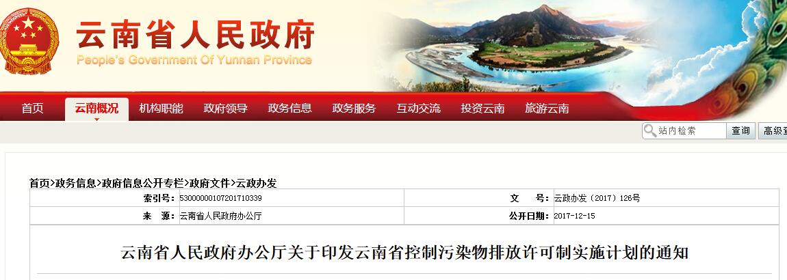 《云南省控制污染物排放許可制實施計劃》已經(jīng)省人民政府同意,現(xiàn)印發(fā)給你們,請認真貫徹執(zhí)行。