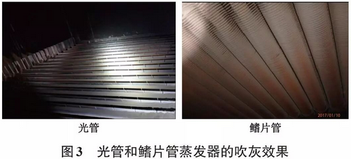 使用半年后,光管蒸發(fā)器、鰭片管蒸發(fā)器吹灰效果見圖3。