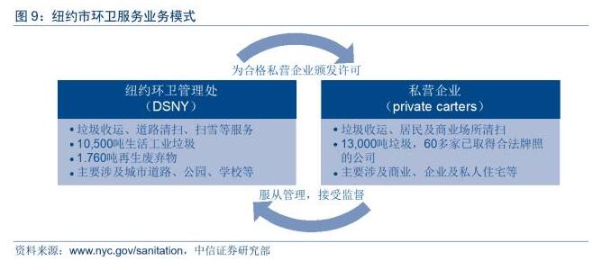 以紐約市為例,其環(huán)衛(wèi)服務(wù)業(yè)由政府環(huán)衛(wèi)管理處與私營垃圾運輸公司共同運營,但私營公司受到環(huán)衛(wèi)管理處監(jiān)管,并要遵守相關(guān)地方規(guī)范。紐約市環(huán)衛(wèi)管理處(DSNY)主要職責(zé)是垃圾收運、道路清潔和清雪,它是世界上最大的環(huán)衛(wèi)管理處,負(fù)責(zé)每天收運紐約市的10,500噸生活垃圾和工業(yè)垃圾以及1,760噸再生廢棄物。紐約市另外13,000噸垃圾由私營垃圾運輸公司(PrivateCartingCompanies)進行收運,環(huán)衛(wèi)管理處對這些私人運營負(fù)責(zé)行使監(jiān)督管理職責(zé),并發(fā)布其需要遵守的法律法規(guī)。