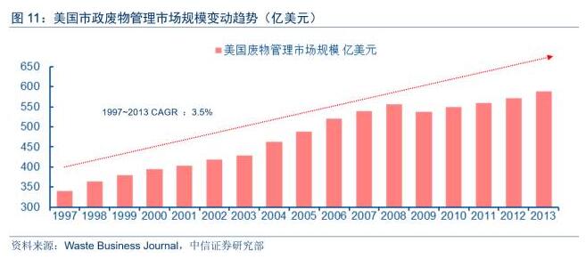 根據(jù)WasteBusinessJournal統(tǒng)計,美國市政廢物管理市場規(guī)模自1997年的341億美元持續(xù)攀升至2013年的589億美元,期間復(fù)合增速為3.5%,高于同期人口增速和廢物產(chǎn)生量增速。受金融危機影響,市場規(guī)模自2008年的55.7億元略微下滑至2009年的53.7億元,但在2011年即恢復(fù)至金融危機前的水平。