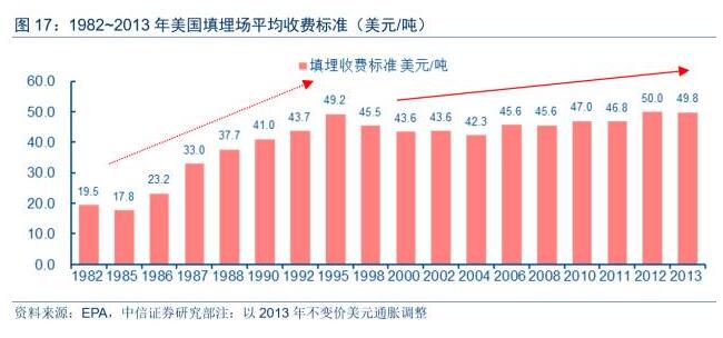 美國市政廢物的填埋平均價格自1985年的17.8美元/噸上升至1995年的49.2美元/噸,10年間價格漲幅接近3倍,收費上漲的主要原因是監(jiān)管加嚴(yán)和標(biāo)準(zhǔn)提升帶動填埋場的建造和運營成本上升明顯,此階段是典型的成本拉動型價格上漲。在2000年之后,廢物填埋收費呈現(xiàn)溫和且持續(xù)的上漲,自2000年的43.6美元/噸溫和上漲至2013年39.8美元/噸,2000~2013年價格復(fù)合增速為1.1%,通脹及寡頭壟斷的市場結(jié)構(gòu)是該階段價格上漲的重要推動力。