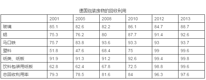 在德國,最常見的包裝材料有玻璃、鋁、馬口鐵、塑料、紙、紙板、木材,全部都能夠被用作二次原料,從而減少對原生原料的需求,可以起到降低能源消耗及污染排放的作用。根據(jù)《包裝條例》的規(guī)定,居民應(yīng)當(dāng)對包裝廢物進行分類投放。條例獲得了廣泛的公眾支持,2013年時德國包裝廢物的回收利用率達到了97%。