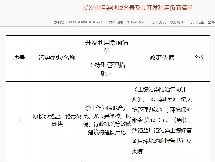 2017年12月26日 長(zhǎng)沙市環(huán)境保護(hù)局公布了《長(zhǎng)沙市污染地塊名錄及其開(kāi)發(fā)利用負(fù)面清單》,共有6塊污染地塊。