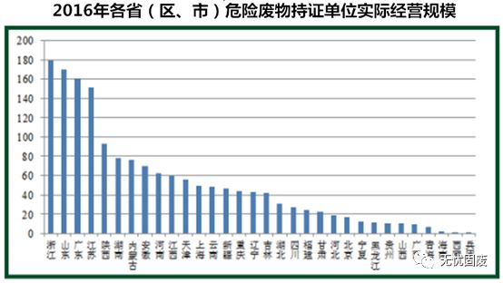 截至2016年,全國危險(xiǎn)廢物經(jīng)營持證單位共2195家,核準(zhǔn)經(jīng)營規(guī)模達(dá)到6471萬噸,平均每家約2.9萬噸。但實(shí)際經(jīng)營規(guī)模為1629萬噸,平均每家不足0.75萬噸。實(shí)際經(jīng)營規(guī)模排在前三位的分別是浙江、山東和廣東。