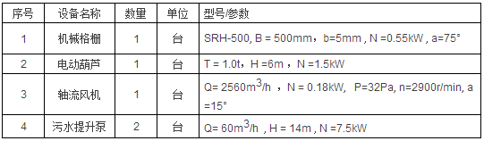 格柵間和污水提升泵房聯(lián)建,室內(nèi)設(shè)置機(jī)械格柵1臺(tái)。格柵間尺寸為7.5m×4.5m×6.0m ,磚混結(jié)構(gòu)。主要設(shè)備如下表。
