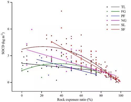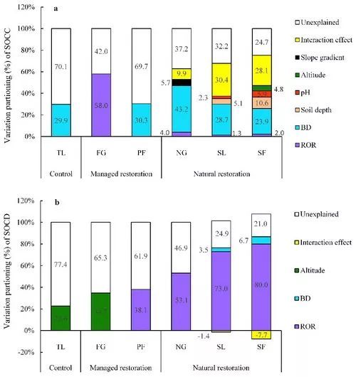 針對這一科學(xué)問題,在王克林和張偉指導(dǎo)下,研究組以耕地為對照,通過分析人工恢復(fù)方式(人工牧草、人工經(jīng)濟林)和自然恢復(fù)方式(撂荒草地、灌木林、次生林)下土壤有機碳變化特征并記錄相應(yīng)的環(huán)境因子信息,解析了不同恢復(fù)模式(人工恢復(fù)和自然恢復(fù))土壤有機碳積累變化規(guī)律,并揭示了其相應(yīng)的環(huán)境驅(qū)動因子。研究發(fā)現(xiàn),自然恢復(fù)模式土壤有機碳含量顯著高于人工恢復(fù)模式和耕地,而短期內(nèi)(9年)人工恢復(fù)模式和耕地之間有機碳含量無顯著差異。不考慮基巖出露對土壤有機碳儲量影響,各植被類型之間有機碳儲量無顯著差異,剔除基巖出露影響后,自然恢復(fù)植被下有機碳儲量顯著高于人工恢復(fù)植被和耕地。方差分解表明,人工恢復(fù)方式下土壤有機碳含量和儲量僅部分變異受環(huán)境因子(如基巖出露率、土壤容重、海拔)影響;而在自然恢復(fù)方式下,環(huán)境因子能有效解釋有機碳含量和儲量的大部分變異,且隨著植被正向演替解釋量逐漸增加,但有機碳含量和儲量的環(huán)境驅(qū)動因子并不相同,前者受多個環(huán)境因子共同驅(qū)動(如土壤容重、基巖出露率、土層深度、pH等),后者則主要受基巖出露率驅(qū)動?;趯Σ煌謴?fù)模式下有機碳含量和儲量變化分析及其環(huán)境驅(qū)動因子評估結(jié)果表明,相比人工恢復(fù)模式,短期內(nèi)自然恢復(fù)更有利于土壤碳固持,且上述環(huán)境因子可作為評估自然恢復(fù)模式下土壤碳庫變化的重要指標(biāo)。