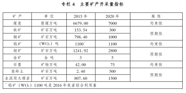 1.礦業(yè)對國民經(jīng)濟(jì)的支撐作用得到進(jìn)一步增強(qiáng)。轉(zhuǎn)變發(fā)展方式,調(diào)整礦業(yè)結(jié)構(gòu),穩(wěn)定石油產(chǎn)量,壓縮煤炭過剩產(chǎn)能,大力發(fā)展石墨、鉬等新材料精深加工業(yè),到2020年全省采礦業(yè)產(chǎn)值力爭達(dá)到2500億元。