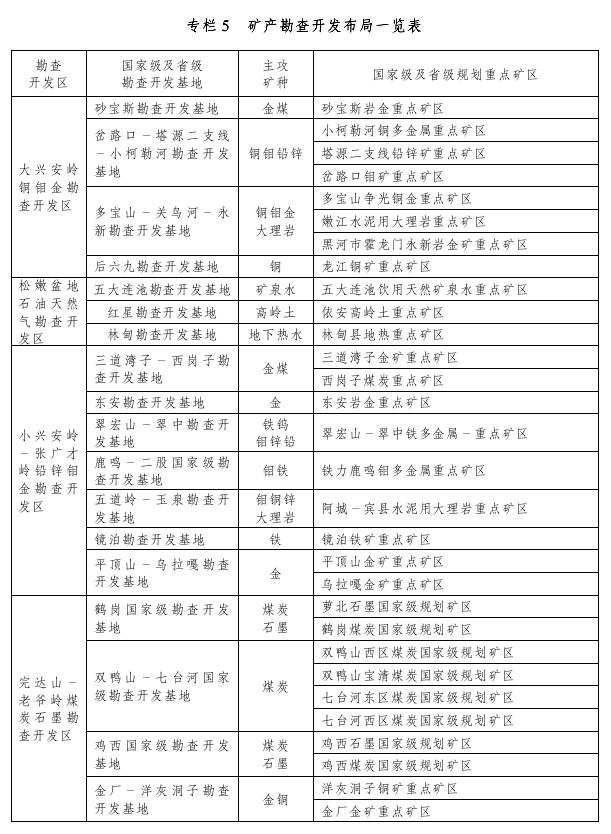 (二)礦產(chǎn)資源勘查開發(fā)基地建設(shè)。在4個勘查開發(fā)區(qū)的基礎(chǔ)上,綜合考慮資源稟賦、開發(fā)利用條件、環(huán)境承載力和區(qū)域產(chǎn)業(yè)布局等因素,劃分出省級勘查開發(fā)基地18個,包括國家級能源資源基地4個。其中大興安嶺銅鉬金勘查開發(fā)區(qū)包括砂寶斯、岔路口-塔河二支線等4個基地;松嫩盆地勘查開發(fā)區(qū)包括紅星等3個基地;小興安嶺-張廣才嶺勘查開發(fā)區(qū)包括三道灣子-西崗子、鹿鳴-二股等7個基地;完達(dá)山老爺嶺勘查開發(fā)區(qū)包括金廠-洋灰洞子、鶴崗、雙鴨山-七臺河、雞西4個基地。作為保障國家資源安全供應(yīng)的核心區(qū)域,納入國民經(jīng)濟(jì)和社會發(fā)展規(guī)劃以及相關(guān)行業(yè)發(fā)展規(guī)劃中統(tǒng)籌安排和重點建設(shè),在生產(chǎn)力布局、基礎(chǔ)設(shè)施建設(shè)、資源配置、重大項目設(shè)置及相關(guān)產(chǎn)業(yè)政策方面給予支持和保障,大力推進(jìn)資源規(guī)模開發(fā)和產(chǎn)業(yè)聚焦發(fā)展。