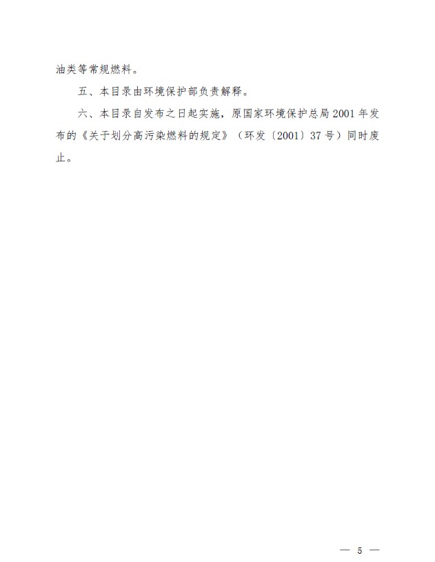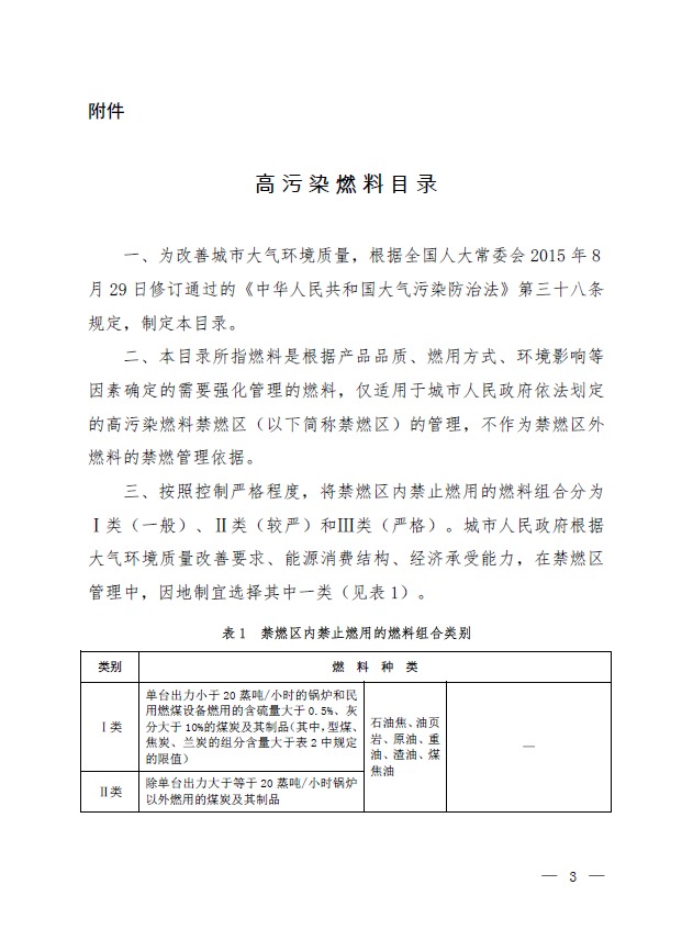 為改善城市大氣環(huán)境質(zhì)量,根據(jù)全國人大常委會2015年8月29日修訂通過的《中華人民共和國大氣污染防治法》第三十八條規(guī)定,我部組織編制了《高污染燃料目錄》(見附件),現(xiàn)予發(fā)布。本目錄自發(fā)布之日起實施。原國家環(huán)境保護總局2001年發(fā)布的《關(guān)于劃分高污染燃料的規(guī)定》(環(huán)發(fā)〔2001〕37號)同時廢止。