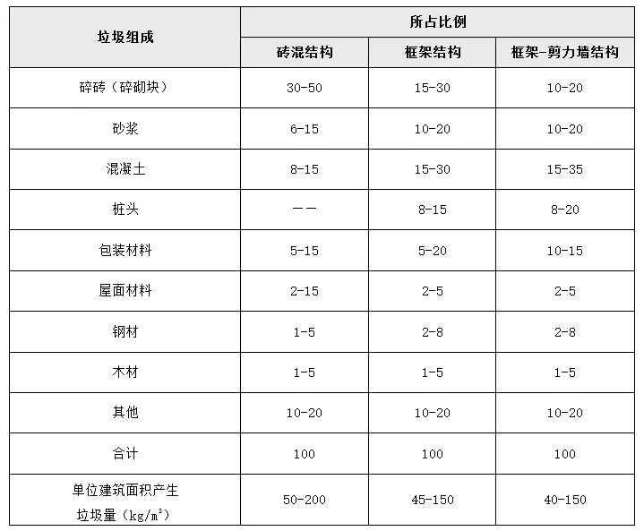 舊建筑物拆除垃圾的組成與建筑物的種類有關(guān):廢棄的舊民居建筑中,磚塊、瓦礫、混凝土塊、渣土約占80%,其余為木料、碎玻璃、石灰、金屬、包裝物、防水材料、各類電信線和電源線、塑料制品等;廢棄的舊工業(yè)、樓宇建筑中,混凝土塊約占50%~60%,其余為金屬、磚塊、砌塊、塑料制品等。對不同結(jié)構(gòu)形式的建筑工地,垃圾組成比例略有不同,而垃圾數(shù)量因施工管理情況不同在各工地差異很大。